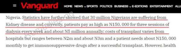 When bacterial travels to the kidney, a patient may need to start nursing kidney infection, Currently dialysis cost nothing less than 150,000 weekly. You know how much that cost on a monthly basis, In one year, that’s about N7.2million.